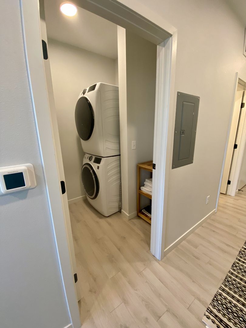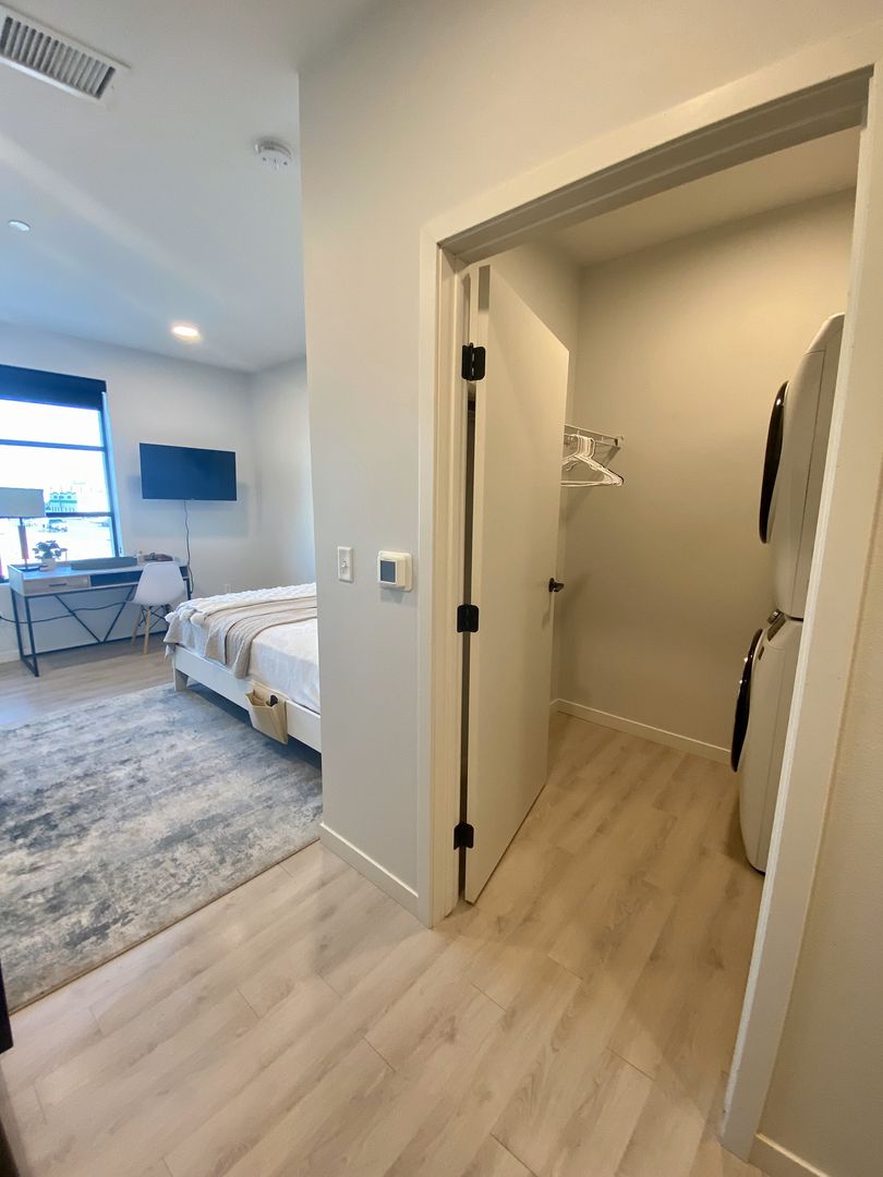 Spacious Alcove Studio, 1 Bath with a pass-through kitchen, stand up shower, an in-home washer/dryer, floor-to-ceiling windows and eastern exposure.